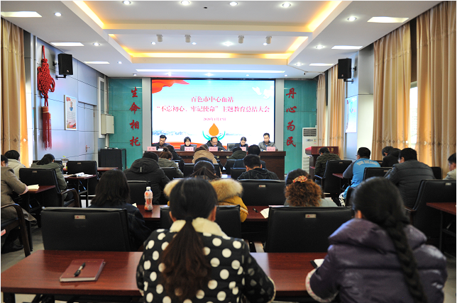 1月17日下午,百色市中心血站在六楼多媒体教室召开“不忘初心、牢记使命”主题教育总结大会,全面总结血站主题教育工作成效,巩固和深化主题教育成果。市卫生健康委“不忘初心,牢记使命”主题教育第二督查指导组成员梁志民、梁为卫出席会议,血站班子、支委成员、各科室负责人、全体党员、入党积极分子、党支部“不忘初心、牢记使命”主题教育领导小组办公室成员参加会议。会议由血站党支部组织委员、副站长陆杰灵同志主持。