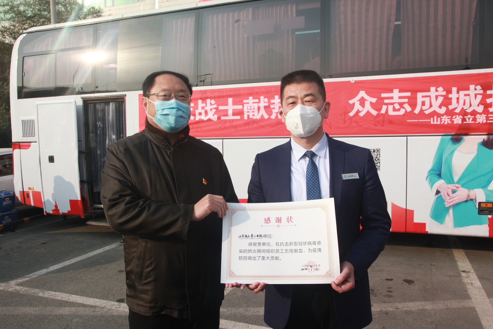 截至当天活动结束,省立三院共有234名医务人员成功捐献热血,累计献血量达53200毫升,极大地缓解了当前紧张的临床用血压力。为感谢省立三院在特殊时期为无偿献血工作做出的突出贡献,山东省血液中心党委书记、主任张新童现场向省立三院赠送感谢状,省血液中心副主任李蓬、纪委书记尹鲲在活动现场陪同慰问参加献血的医务工作者。