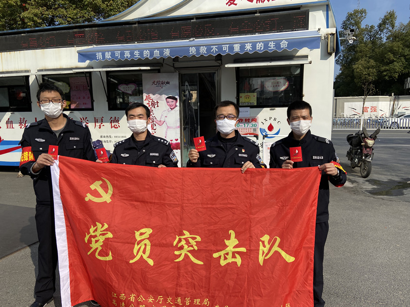 2月1日,南昌市高新区高速交警直属一支队第二大队的4名党员突击队成员,来到上海路家乐福献血屋参加无偿献血,累计献血1300毫升。