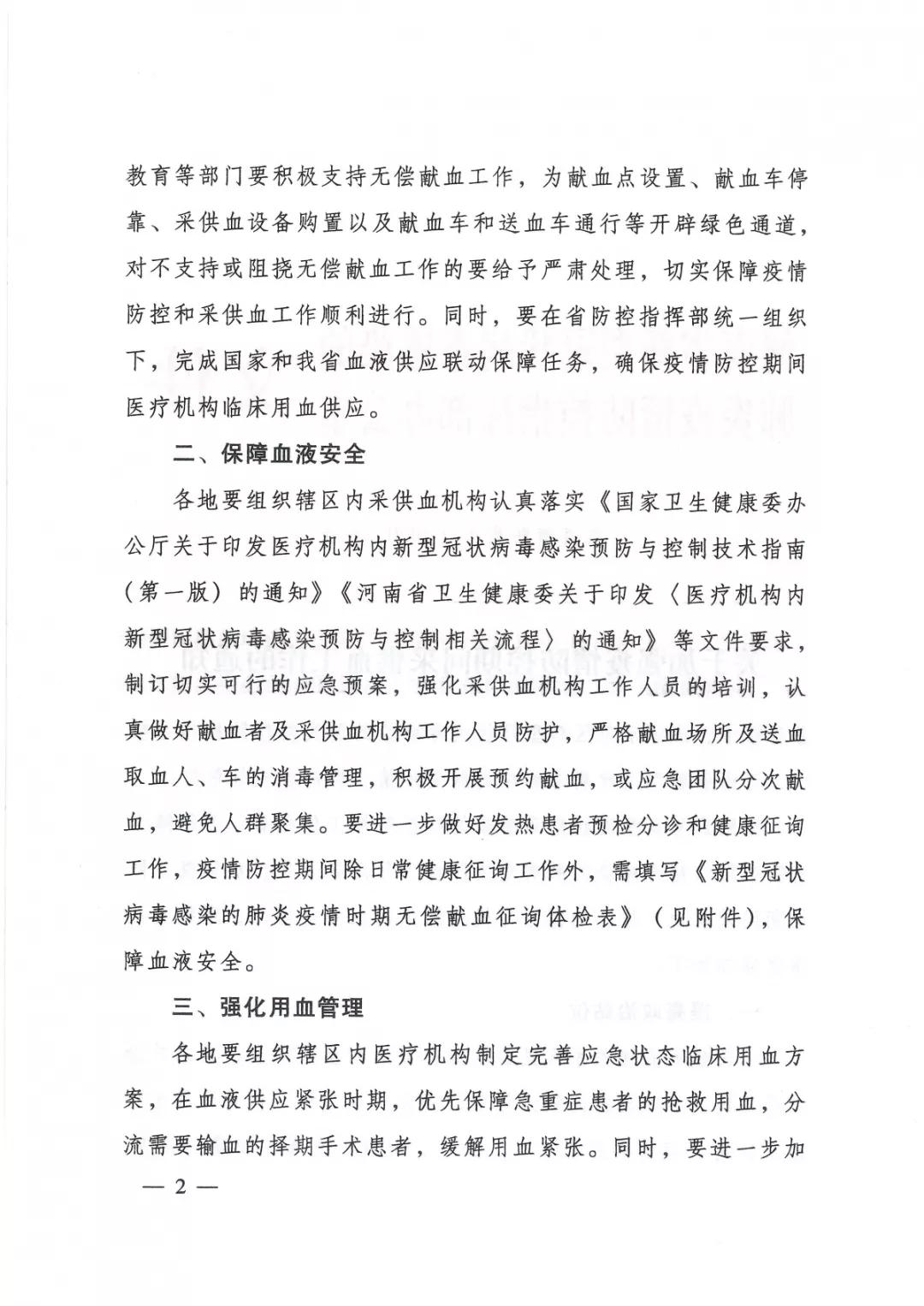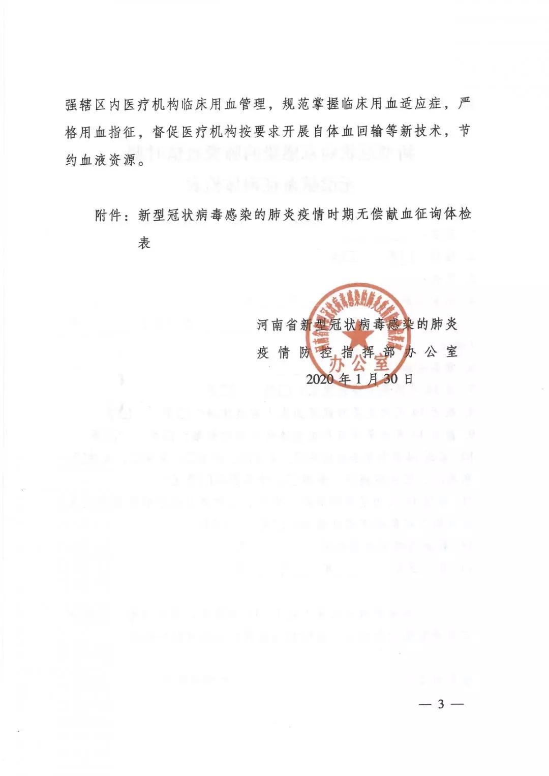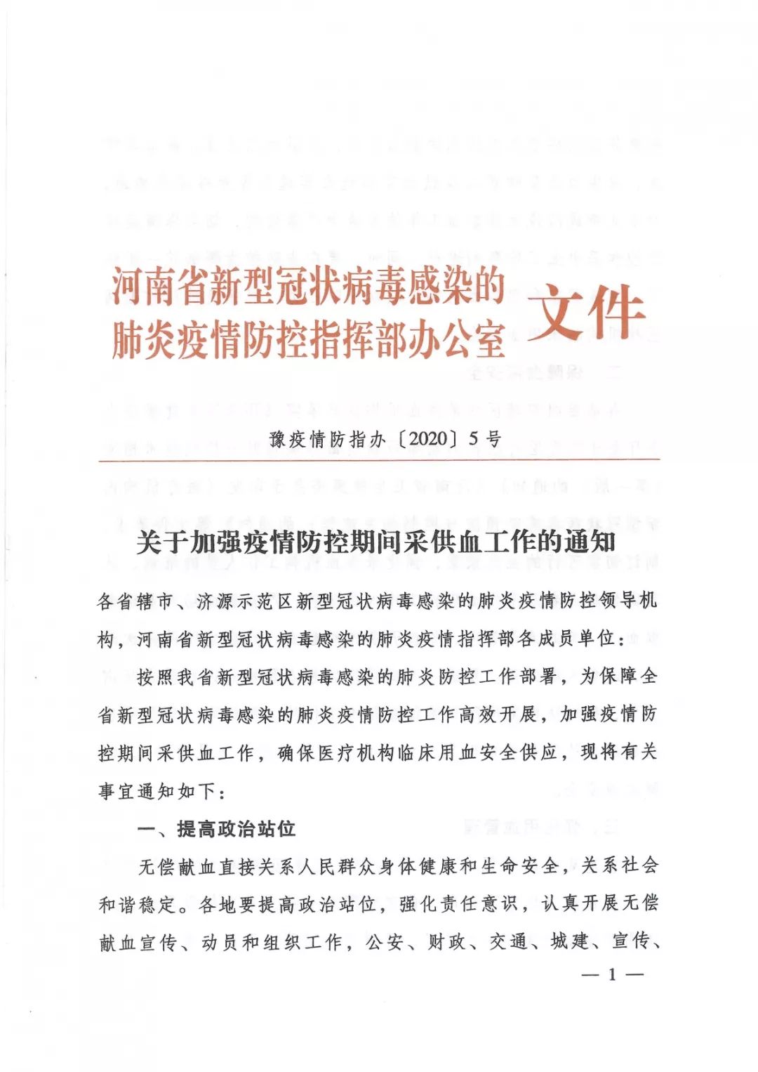 1月30日,河南省新型冠状病毒感染的肺炎疫情防控指挥部办公室印发豫疫情防治办【2020】5号文件《关于加强疫情防治期间采供血工作的通知》,文件指出,无偿献血直接关系人民群众身体健康和生命安全,关系社会和谐稳定。各地要提高政治站位,强化责任意识,认真开展无偿献血宣传、动员和组织工作,公安、财政、交通、城建、宣传、教育等部门要积极支持无偿献血工作,为献血点设置、献血车停靠、供血设备购置以及献血车和送血车通行等开辟绿色通道,对不支持或阻挠无偿献血工作的要给予严肃处理,切实保障疫情防控和采供血工作顺利进行。同时,要在省防控指挥部统一组织下,完成国家和我省血液供应联动保障任务,确保疫情防控期间医疗机构临床用血供应。