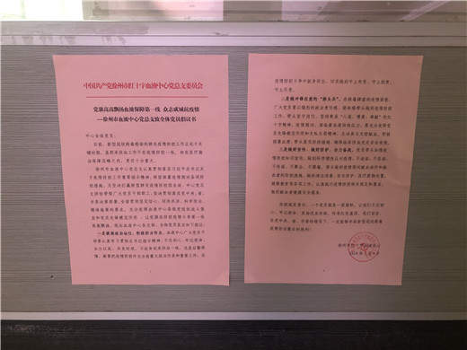 为了认真贯彻落实习近平总书记关于疫情防控工作重要指示精神,周密部署疫情期间各项防控措施,坚决打赢新型肺炎疫情防控阻击战,市血液中心党总支团结带领广大党员干部职工,坚决落实党中央、省、市委决策部署,全面贯彻坚定信心、同舟共济、科学防治、精准施策的要求, 充分发挥徐州市中心血站各级党组织战斗堡垒和党员先锋模范作用,让党旗在防控疫情和血液保障第一线高高飘扬。