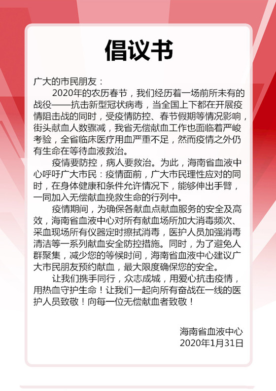 受疫情影响,当前我省临床医疗用血严重不足,为此,海南省血液中心向全省各界爱心人士发出呼吁: