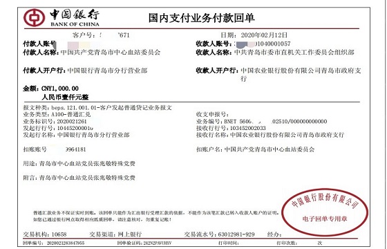 后勤党支部党员张兆敬是总务科设备管理岗位的一名工程师,2008年进入血站工作,是一名地地道道的血站老职工,更是一名有着15年党龄的老党员。“作为后勤工作岗位的一名老党员,不能像医生护士们一样到疫情防控一线去救治病患,与肺炎疫情作斗争,我愿交上1000元特殊党费,在完成好本职工作之余为打赢这场疫情阻击战再尽一份力。”2月10日,血站政工科党务干部在手机微信上收到来自后勤党支部党员张兆敬的一笔1000元的特殊党费。目前,血站党委已按规定接纳这部分特殊党费,并按程序逐级缴至中组部特殊党费专用账户。
