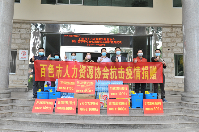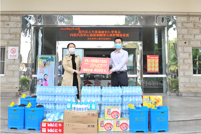 2月15日上午,百色市中心血站收到来自百色市人力资源服务行业协会捐赠的一批价值4500元的含氯消毒剂、消毒喷洒器具等爱心防疫用品以及红牛、纯净水等日用物资。