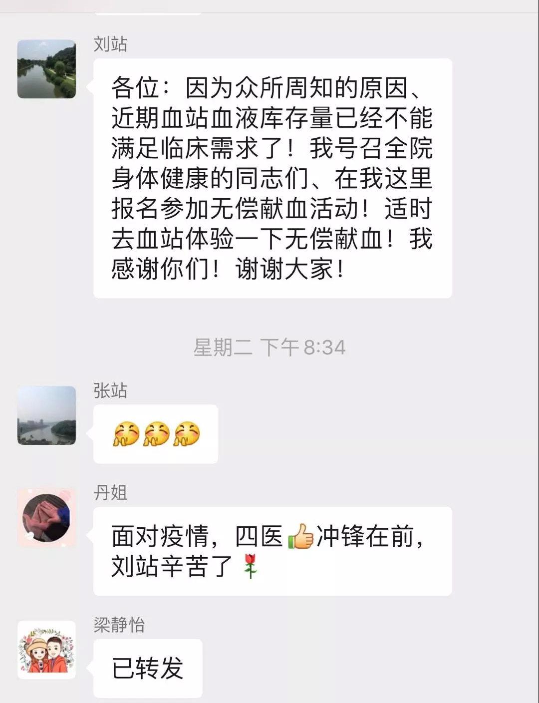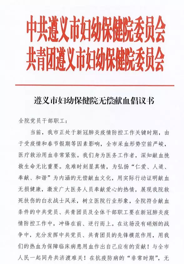为缓解采供血紧张局面,我站党总支和行政共同发出倡议,号召全站党员、干部职工在疫情防控期间积极参与无偿献血。在我站发出无偿献血倡议书之后遵义市第四人民医院、共青团遵义市委、遵义市妇幼保健院以及一些街道办事处、村、镇也“一呼百应”纷纷在微信工作群发出无偿献血的倡议,请大家伸出手臂,奉献爱心、挽救生命,我们一起守护健康,守护名城,得到广大干部职工、青年志愿者和市民的积极响应全民行动、众志成城!