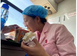 献血车厢尾部不足1平米的狭小空间是唯一属于工作人员能吃午饭的地方。非常时期,方便面配馒头就是车组人员的豪华午餐,而午饭时间,正是献血者最集中地时候,因此,车组人员的午饭往往成了晚饭,但她们却很开心,她们说:“特殊时期,吃饭越晚说明来献血的人越多,临床血液供应就多了一份保障,再饿都值得。”