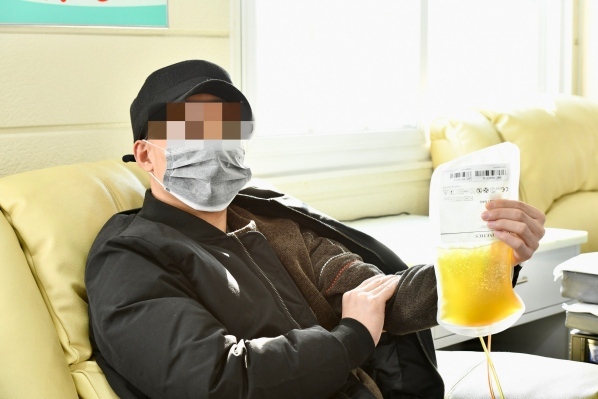 2月16日下午2点,在常州市中心血站吾悦爱心献血屋内,一名新型肺炎康复者正在捐献血浆,该康复者于2月4日出院,为常州首名新冠肺炎出院者,同时也是常州市新冠肺炎康复者中的首位血浆捐献者。