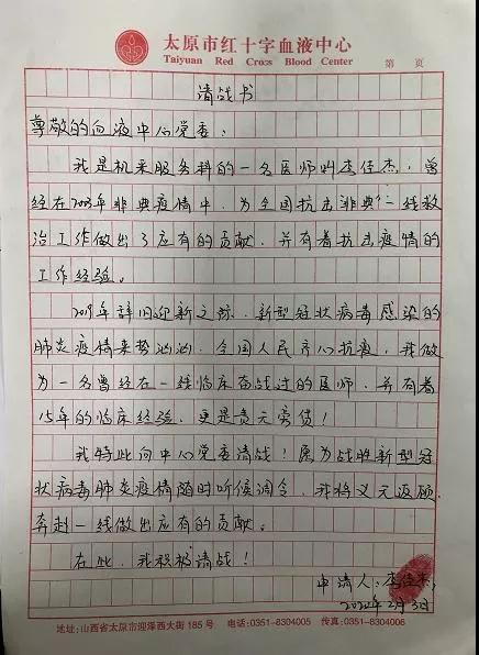 这次的新冠肺炎疫情,他不再是临床医生,似乎不用再冲向一线的战场。但他始终认为:作为一名由15年临床经验,曾经站在一线临床奋战过的医师,对于这次疫情,他责无旁贷,因此,他提笔写下请战书,“愿为战胜新型冠状病毒肺炎疫情随时听后调令,我将义无反顾,奔赴一线做出应有的贡献!”