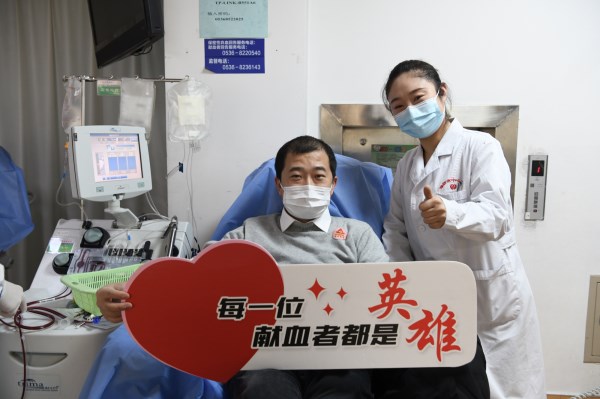 潍坊:普通农民夫妇乘车近两小时献热血 自费印条幅呼吁无偿献血