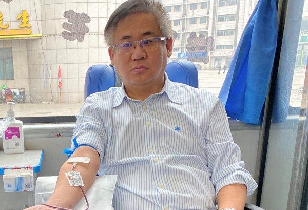 东丽区民营企业津都科技集团有限公司董事长杨鑫波来到天津站献血车无偿献血,这是他在为东丽区所有留观点和相关社区捐赠食品、物资后,再次为爱逆行。