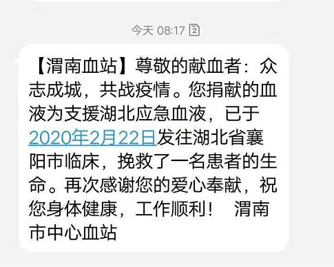 在完成血液调配驰援任务后,渭南市中心血站第一时间对调配血液的献血者发放了告知和感谢短信,让献血者再次感受到自己的爱心奉献得到了升华。