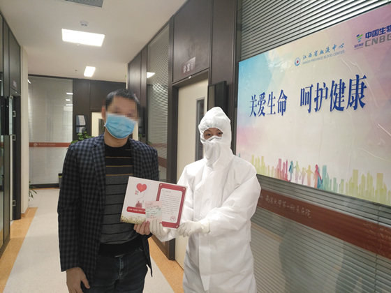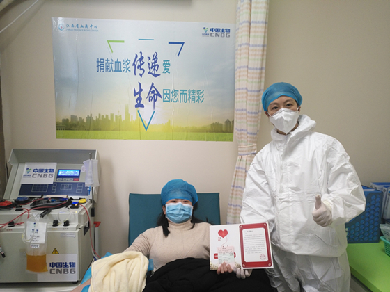 在江西省血液中心设置在南昌大学一附院象湖院区的血浆捐献点,来自南昌的张女士和王先生,分别每人捐献了300毫升恢复期血浆。他们均表示:“希望自己捐献的血液可以挽救重症和危重症新冠肺炎患者的生命。”