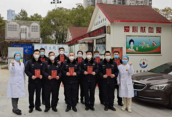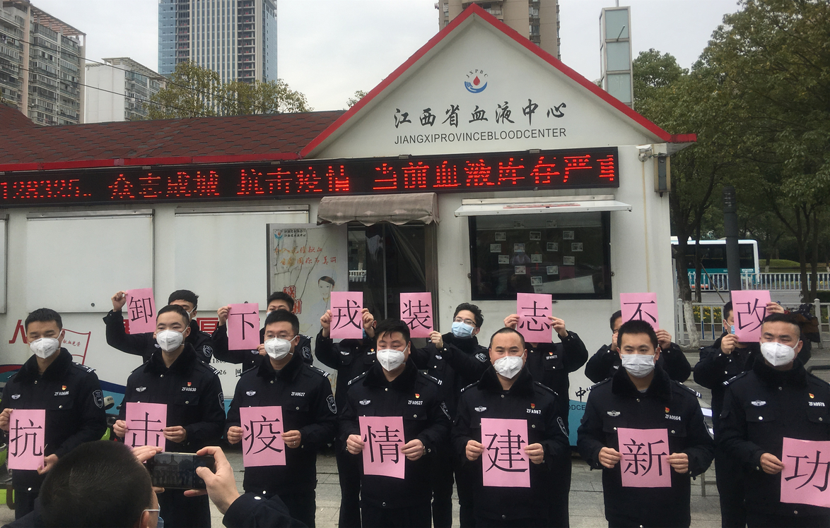 2月21日,江西省轨道集团地铁执法支队的一群退役军人,来到江西省血液中心丽景路天虹献血屋挽袖献血,当天11人成功献血2400毫升。