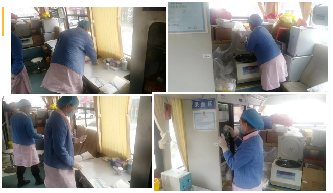 上午8点左右,献血车到达指定献血点,为了给献血者提供干净整洁的献血环境,血站的医护人员对采血车、仪器设备、采血位等进行了全面的消毒,从而以最大限度的防护措施,预防病毒的传播。疫情期间对每位前来献血的献血者,工作人员比以往更加严格进行献血前体检征询、体温筛查、分流引导等,更好地让献血者放心、安全的献血。