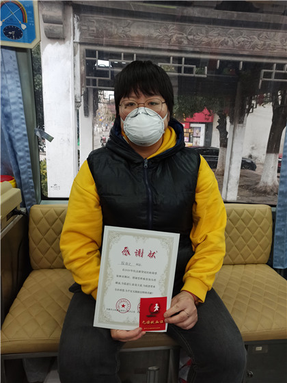 沈卫愉,无锡市荣巷街道桃园的一名社区工作人员,疫情期间始终坚守在疫情防控执勤一线。当接到血站急需用血的招募电话时,她没有丝毫犹豫,最终于2月15日利用中午轮班的间隙成功献血400毫升,她说:“国家兴亡,匹夫有责!医疗战士们在前方冲锋陷阵,人家都能豁出命的,我们献点血算的了什么?”