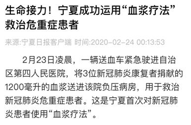 截止到目前,宁夏已有两批5名新冠肺炎康复者捐献血浆,用于临床新冠肺炎危重患者的治疗。