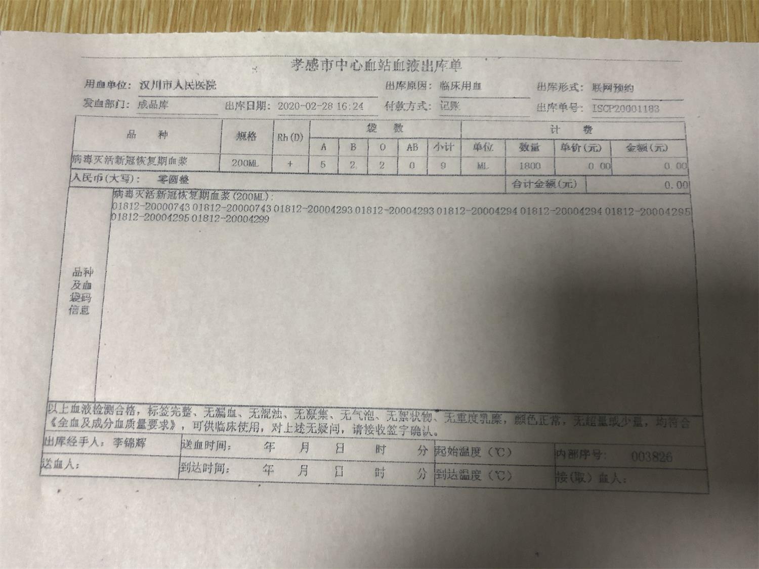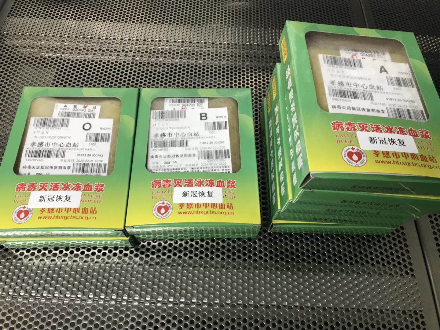 2月28日16时24分,1800毫升血浆从孝感市中心血站发往汉川市人民医院,用于新冠肺炎病人救治,其中A型1000毫升,B型和O型各400毫升。这些血浆全部来源于新冠肺炎康复者无偿捐献。