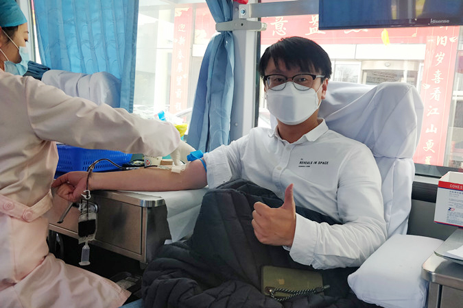 早上8∶00,献血车刚到广电总台大院,总台办公室副主任刘芝坚就迎接上来,要求保安师傅对血站的工作人员测量体温,随后协助现场工作的开展。前来献血的志愿者有说有笑,大家经过填表、验血等一系列严格的献血流程后登车献血。殷红的血液带着体温,从他们的手臂缓缓流入采血袋。这些前来献血的员工中,既有多次无偿献血的老同志,也有刚刚参加工作第一次献血的新员工,大家用实际行动履行一个公民的光荣义务,为社会奉献爱心。刘芝坚说:“我台每年春节后都会组织无偿献血活动,这已经是惯例了,今年由于新冠疫情,台领导相当重视,要求各部门提前统计报名人数,活动当天分批次前来献血。”刘主任还介绍到,“广电人”自疫情发生以来始终在一线坚守工作,在这特殊时期“广电人”更是站出来撸袖献血,以保障临床用血需求。