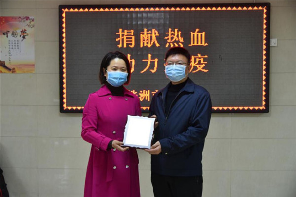 市中心血站党总支书记、站长刘昕晨为市信访局的爱心义举颁发感谢状