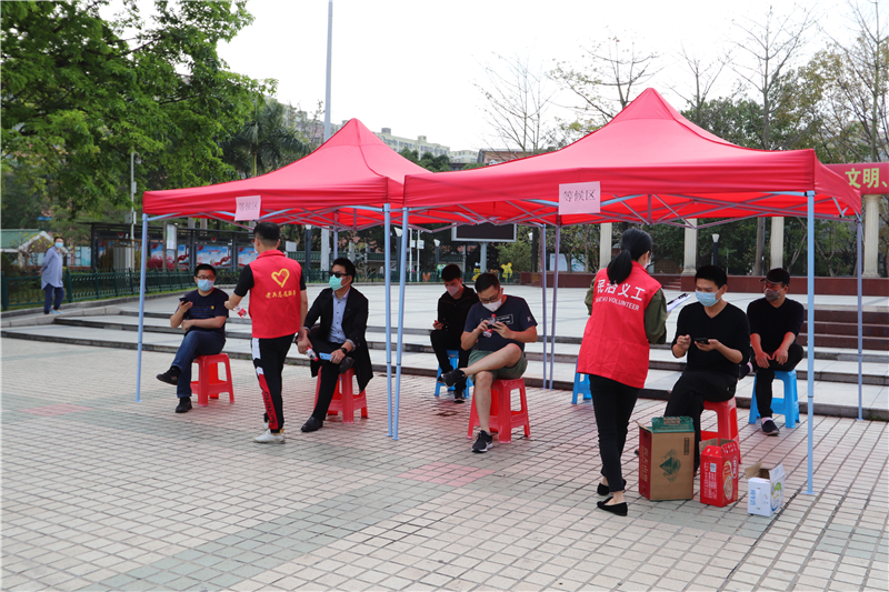 一大早,退伍的军人们就到了献血地点集中,说是集中,每个人却都是自觉的间隔1米,轮流到填表处填表,填表之余工作人员进行体温测量。一位退伍老兵衣袖上“八一”的标识在阳光的照射下显得十分醒目。