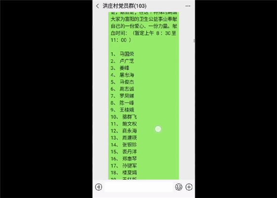 一、召集村干,分头通过几个微信群发送献血倡议,包括洪庄村的党员群、村民代表群、企业群、村微群等,倡议各位村民来献血。