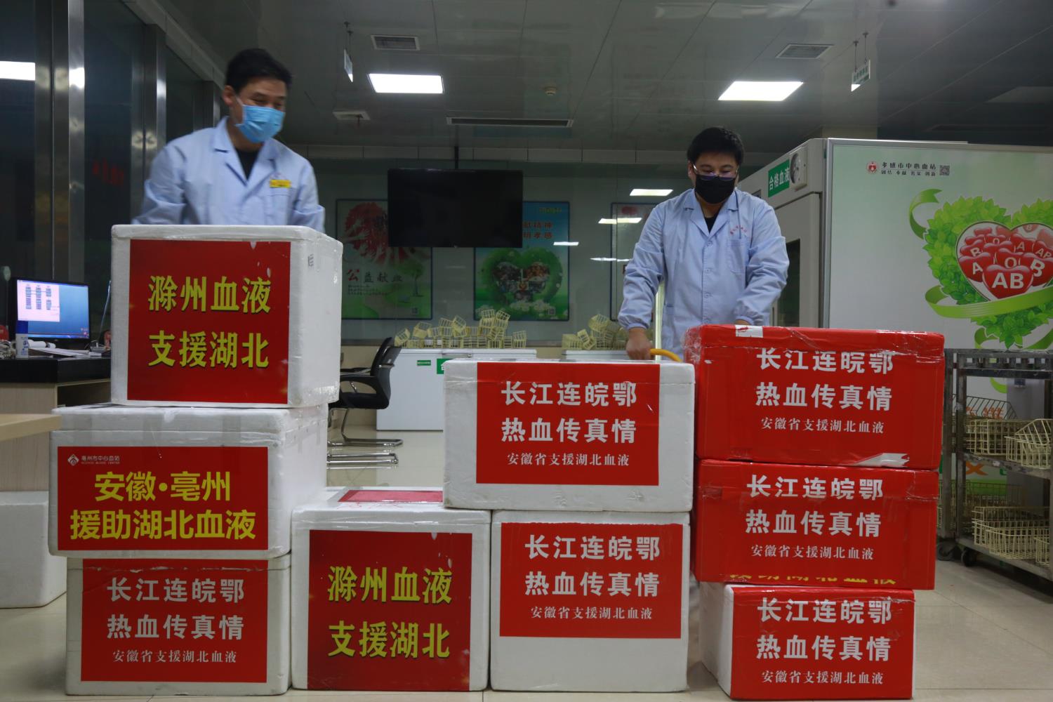 当晚19点40分,孝感市中心血站前往黄冈市中心血站负责接收的两辆送血车安全回孝。孝感市中心血站供血科工作人员连夜对调入的16万毫升血液进行逐袋核对,并分类入库。(见下图)