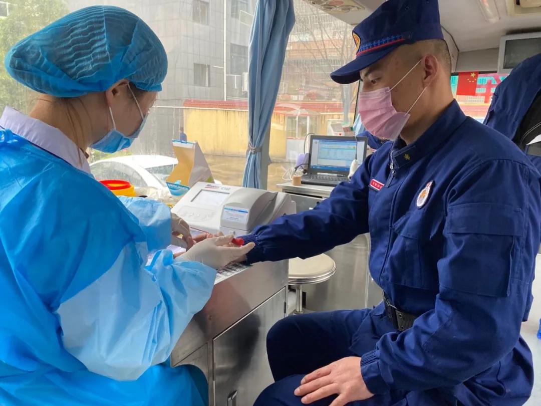 指战员们主动配合医务工作者做好填表、验血、采血工作,对医务人员疫情期间做出的贡献表示崇高的敬意。