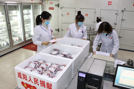 3月9日上午,在咸阳市中心血站供血科,工作人员将62000毫升血液出库、装箱,准备驰援湖北。9点,咸阳支援湖北第三批爱心血液从咸阳市中心血站启程,这批承载着咸阳人民深厚情谊的爱心血液,将由省血液中心统一运送至陕鄂交界处,与湖北省完成交接,驶向抗“疫”一线,为湖北同胞抗击新冠肺炎疫情又一次贡献咸阳力量。