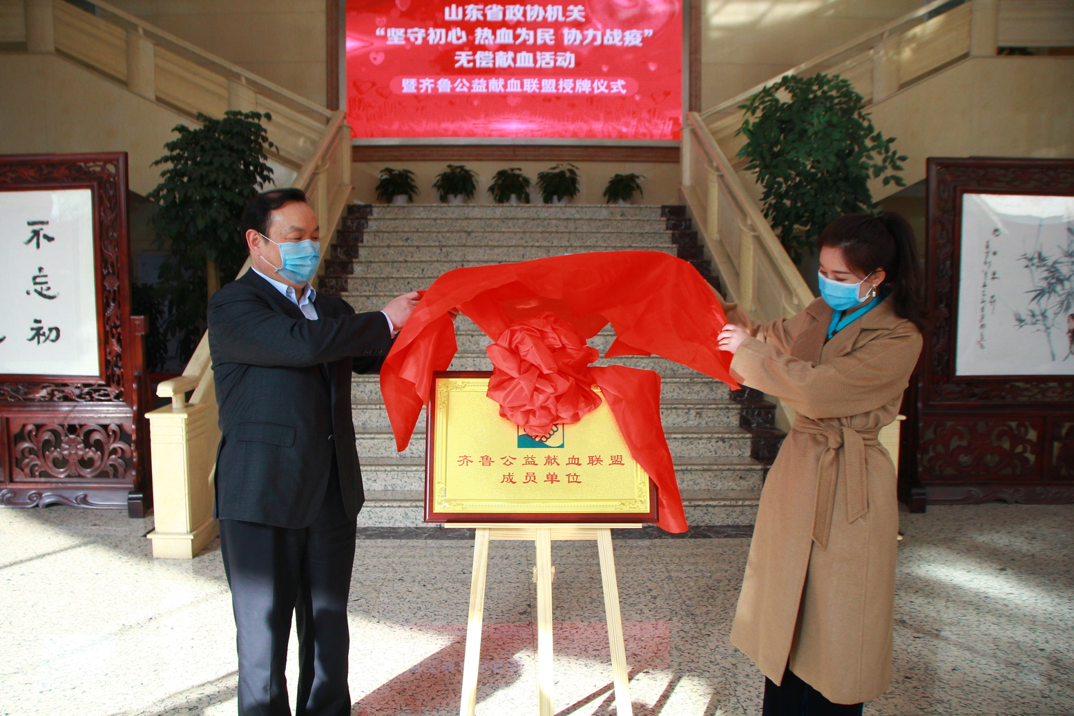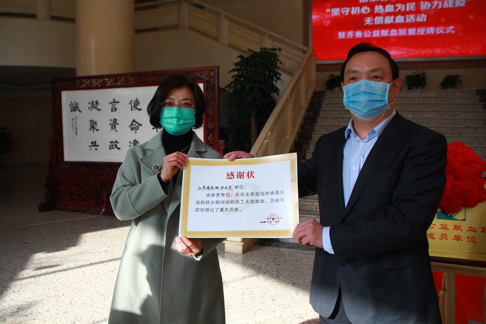 在活动过程中,同时举行了齐鲁公益献血联盟揭牌仪式。省政协副秘书长、办公厅主任燕翔与齐鲁公益献血联盟执行主席、山东电视台齐鲁频道著名主持人书匀共同为齐鲁公益献血联盟揭牌,省政协办公厅成为齐鲁公益献血联盟第59家成员单位。随后省血液中心副主任李蓬向省政协办公厅赠送了感谢状。