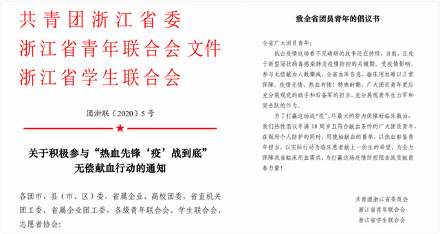 3月9日,团省委联合省青联、省学联等发文向全省广大团员青年发出倡议,号召全省团员青年,尤其是团干部,青联委员,高校学生党员、入党积极分子、学生干部、志愿者骨干等积极参与“热血先锋 ‘疫’战到底”无偿献血行动,呼吁年满18周岁且符合献血条件的在杭、在浙大学生们,在做好个人防护的同时,都能挽起手臂参与无偿献血,为挽救他人生命,为保障临床用血贡献青春力量。