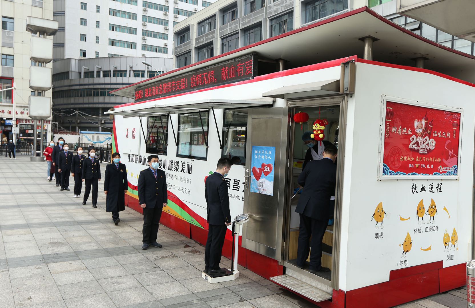 下午两点半,一群身着铁路制服的年轻人有秩序的分批走上了火车站献血屋,由之前说好的11人,增加到了14人。前来献血的南客青年前后左右自觉各保持至少一米以上的距离,进场前,医护人员对献血爱心人士依次进行全身酒精消毒、测量体温、信息登记、血液检验、静脉采血等环节。