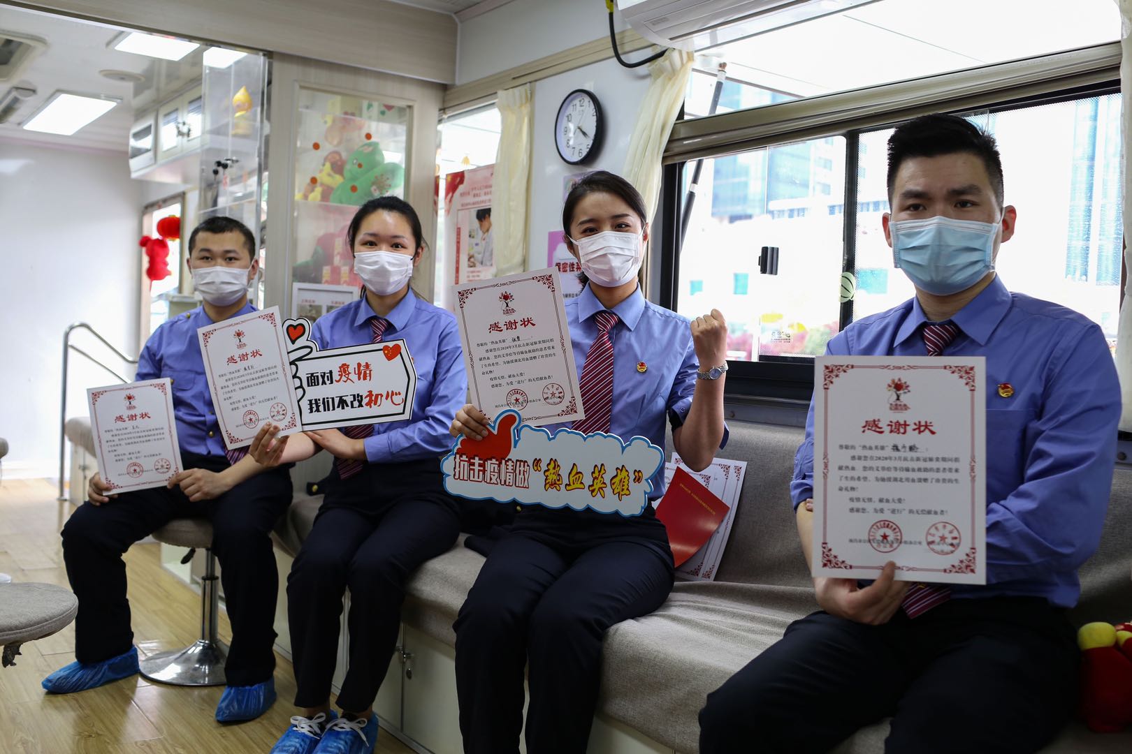 口罩遮掩不住他们的微笑。经过两个半小时的忙碌,14名南客人拿到一张制作精美,色泽鲜红的献血证和市政府签发的感谢状。“就觉得自己还是挺坚强的!”刚抽完血还捂着胳膊的女孩儿刘霞说道。献血结束后,这群年轻人纷纷拿出自己的感谢状围在团旗周围留下了这光荣的一瞬间。本次献血活动累计献血5300毫升,为疫情防控期间缓解血液库存压力给予了极大的帮助。