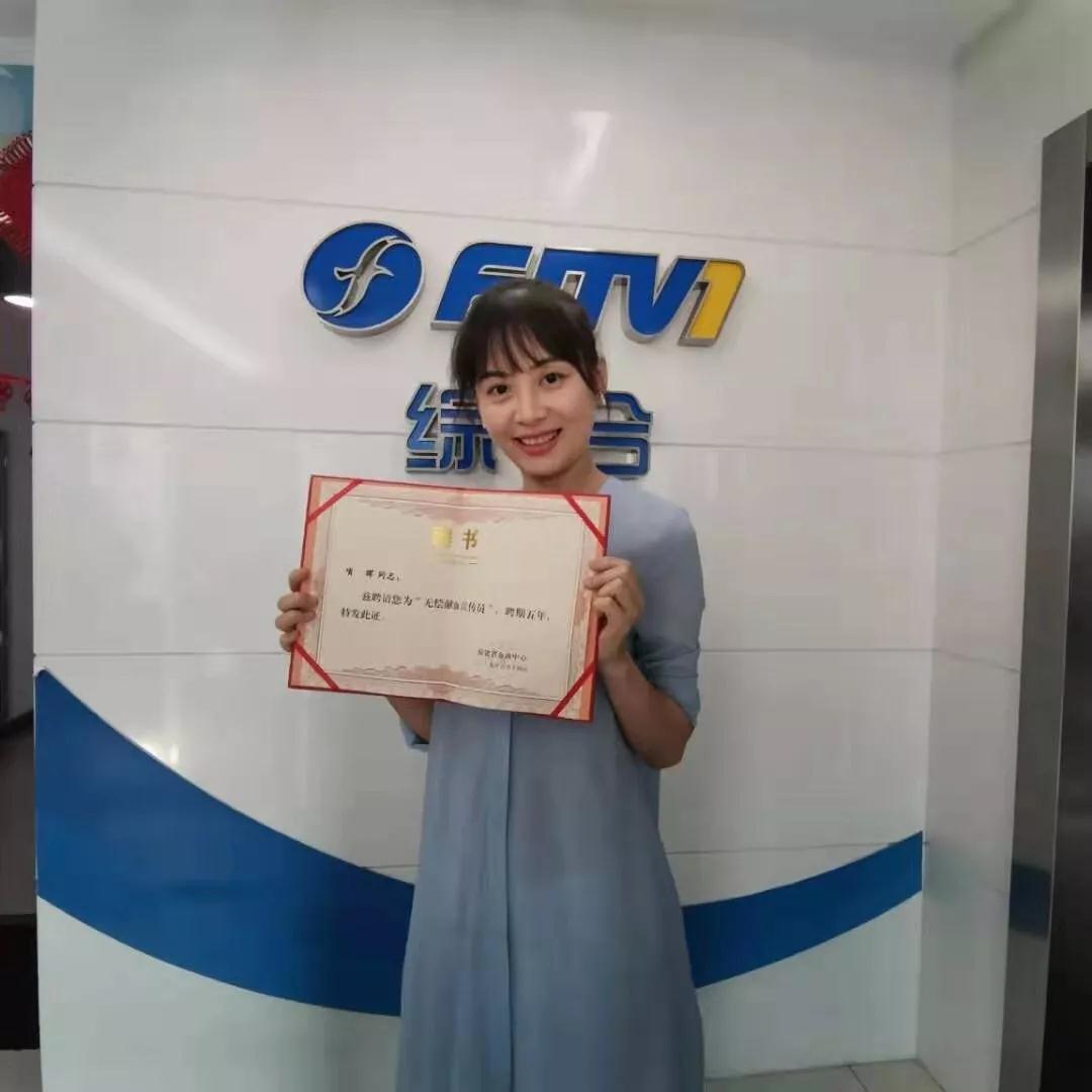 2019年,项晖被正式聘为福建省血液中心无偿献血宣传员。手持证书的她,笑言证书虽小,但责任很重!
