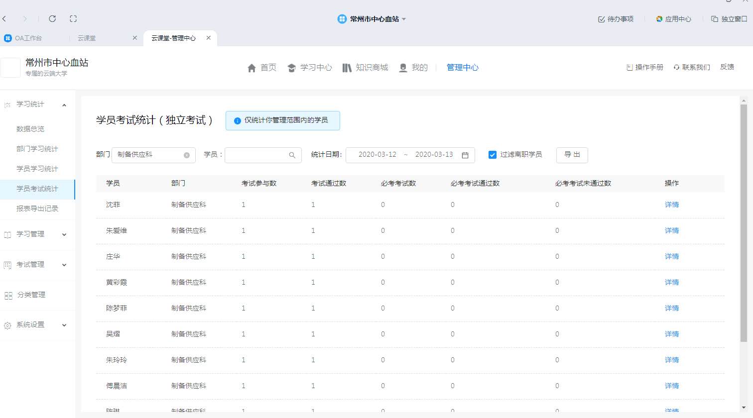 近日,常州市中心血站完成对全体职工关于《新冠肺炎疫情防控知识》的培训考试。在新冠肺炎疫情防控的特殊时期,学习相关防护知识至关重要。根据《血站管理办法》,“血站工作人员每人每年应当接受不少于75学时岗位继续教育。”常州市中心血站每年根据职工的培训需求制定不同的培训计划。今年受新型冠状肺炎疫情影响,常州市中心血站及时调整全员培训方案,将全站集中授课的培训考试方式改为网络培训考试。本次培训内容下发在OA网培训园地供全体职工网上自主学习,并组织职工登陆钉钉软件,在规定时间内进行网上考试。