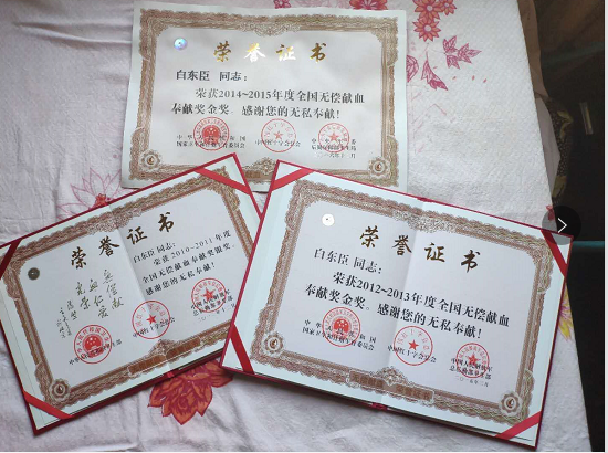如今家里储物柜的抽屉里厚厚的一摞献血证和一张张荣誉证书见证了他无偿献血的光荣历程。