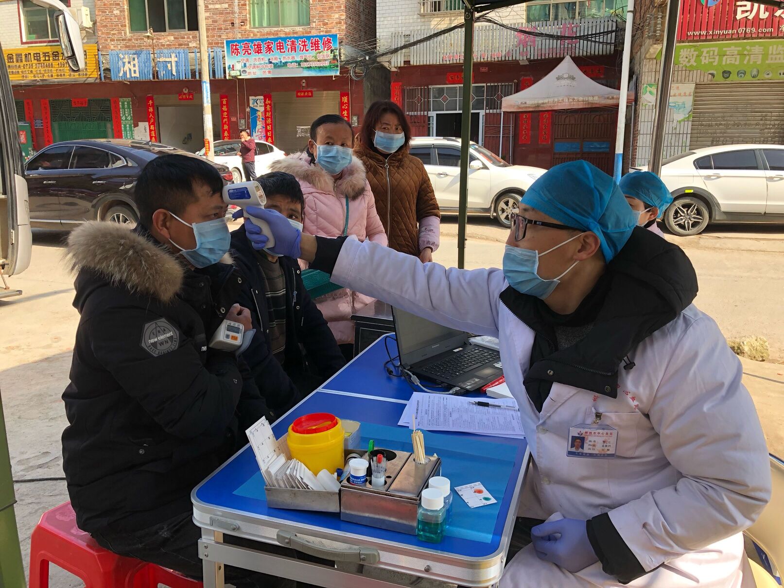 郴州市中心血站工作人员正在给献血者量测量体温