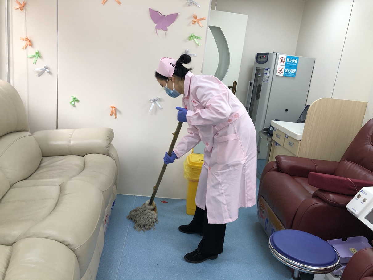 工作人员正在对献血环境进行全面清洁消毒