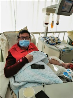 餐馆老板吴龙华献血已有二十余年,看到微信群的招募令,他第一个报名。以前捐献血小板都在血站,今天大家看到他倍感亲切,他感慨地说:“想当初太不容易了,捐个血小板得花费大半天时间,来回路途折腾就要三个多钟头,幸亏东台成立了机采室。”那些年虽说很辛苦,但只要接到血站的电话,作为机采应急献血队员的他从不犹豫,放下活儿就赶去献血。他觉得,挽救患者比什么都重要,钱可以再赚,但生命不可以重来。有时间他还参加志愿服务,经常动员老同学、老战友参加献血活动。越是关键时刻,我们越应该积极承担起社会责任,这是他坚守的信念。