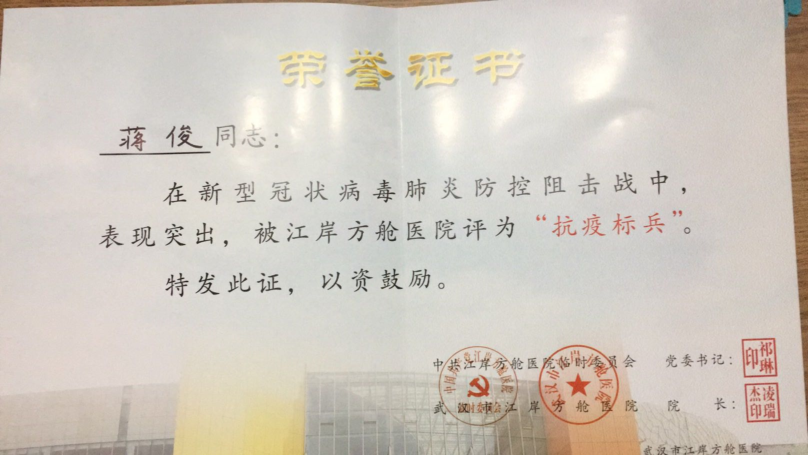 根据江西省卫生健康委统一部署,2月9日,江西省血液中心蒋俊同志临危受命,随国家(江西)紧急医学救援队于上午11点启程奔赴武汉,执行疫情防控救治的任务。在武汉的日子里,他和队友日夜奋战在抗击疫情的一线。蒋俊同志作为后勤保障人员,主要任务是运送抗疫物资、接送救援队医生、护士到方舱上下班,并完成出舱人员的消杀等。因为在新型冠状病毒肺炎防控阻击战中表现突出,蒋俊同志被江岸方舱医院评为“抗击标兵”。