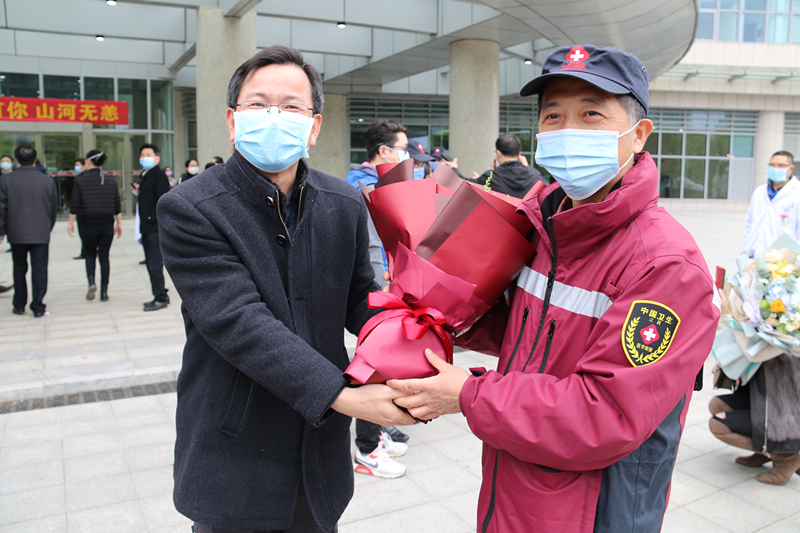 春暖花开日,英雄凯旋时。4月1日下午,国家紧急医学救援队(江西)援助武汉医疗队40人、9辆救援车辆进入南昌市区,回归到大本营——江西省人民医院红谷滩院区停靠交接。这是江西援助湖北11批医疗队中第1批返回本埠的队伍。江西省血液中心蒋俊同志随队平安返昌。省血液中心主任范为民、副主任苗燕平、纪委书记周冬根等领导到现场迎接,欢迎英雄的白衣战士凯旋。