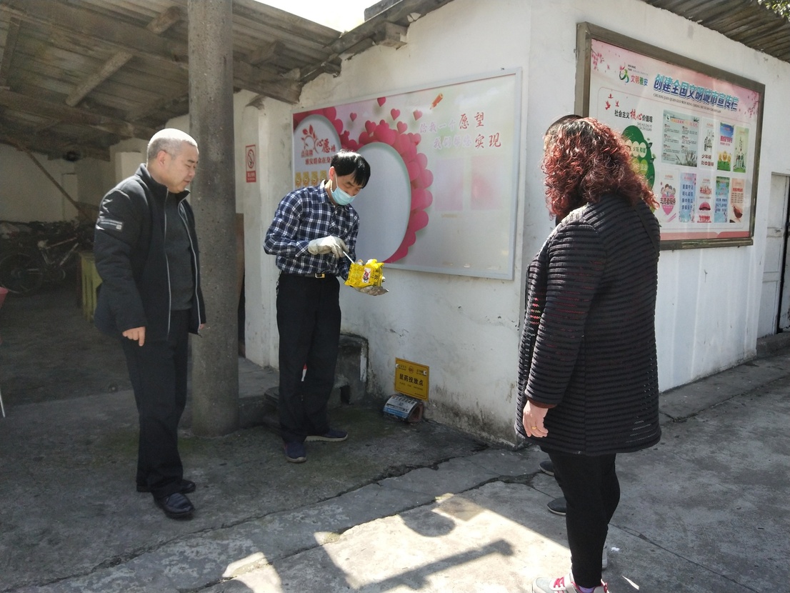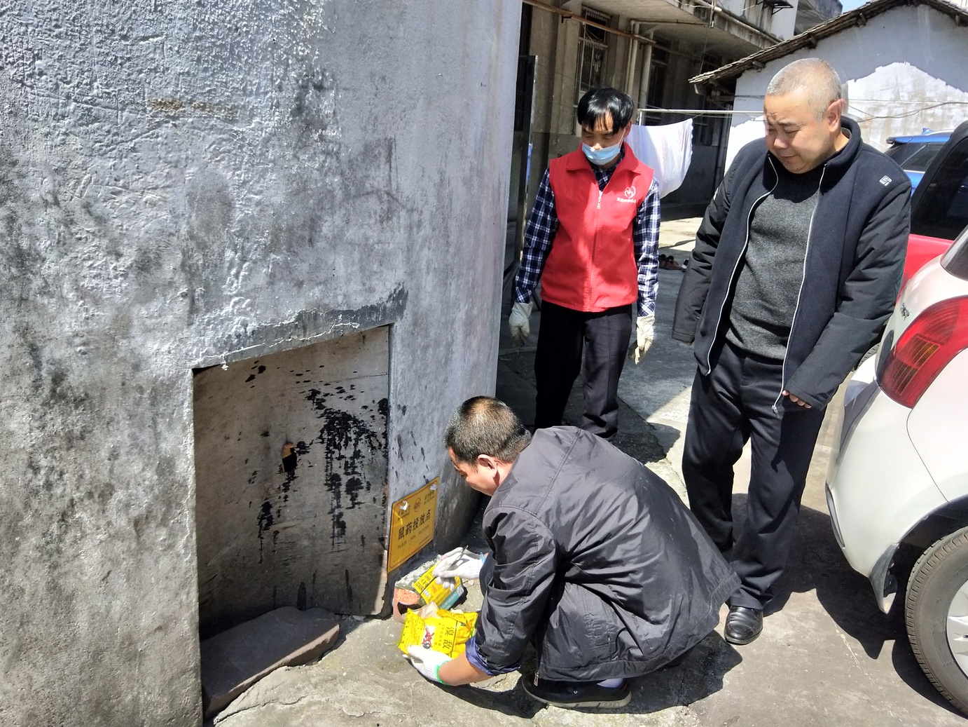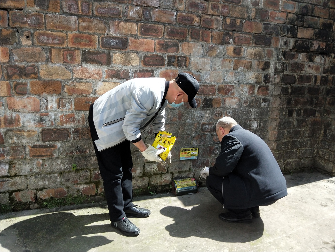 在对大院枯枝、落叶、纸屑、烟头、小区住户楼道以及路边绿化带的垃圾杂物和卫生死角进行巡查清理的基础上,以消除“四害”孳生环境为重点,工作人员逐一检查了院落各处设置的毒饵盒投放盒状态和警示标志,将灭鼠毒饵进行了补充投放。同时,向大院群众开展了病媒生物防治宣传,提醒小区居民注意保护小孩和宠物的安全。