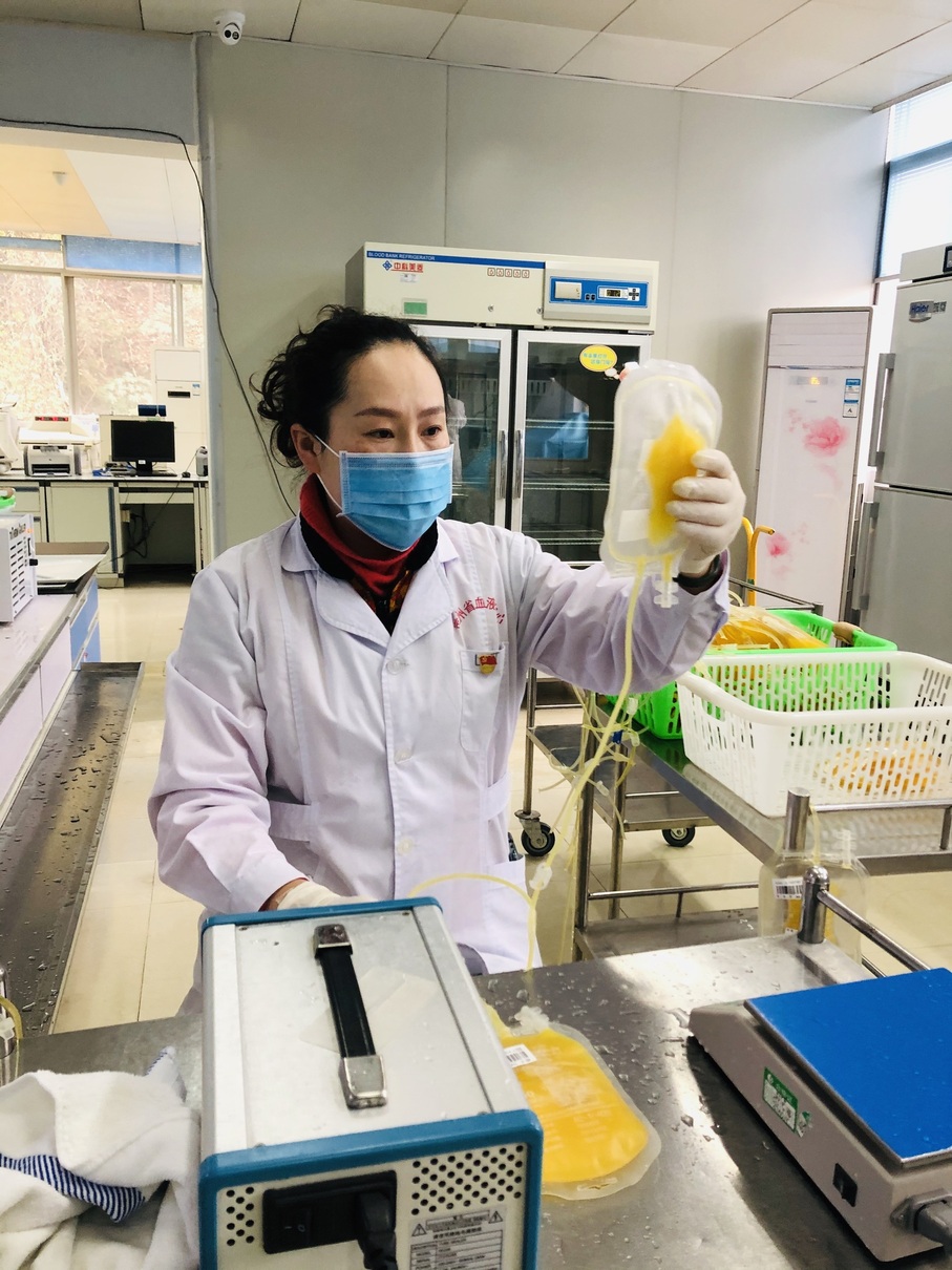 目前,新冠肺炎康复者恢复期血浆可以用于治疗新冠肺炎重症、危重症患者,省血液中心承担着全省新冠肺炎康复者恢复期血浆的检验、采集、制备等相关工作,已先后于2月24日、28日、3月3日、9日、13日、17日、4月3日,在省血液中心、省职工医院、省将军山医院新冠血浆采集点,采集和参与指导采集18人共计6600毫升血浆,每次采集任务完成后,成分制备科的工作人员都会在第一时间对血浆进行接驳分装、病毒灭活等工作,以保证经过灭活 处理的血浆可以尽早发往临床,用于救治新冠肺炎重症、危重症患者。