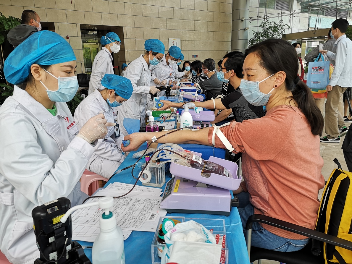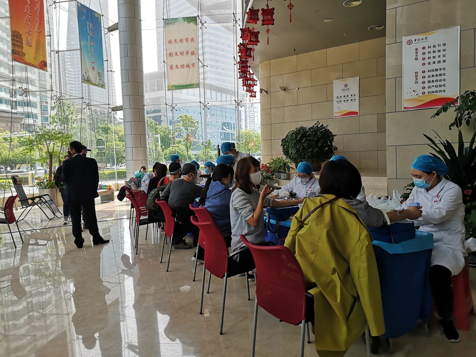 4月16日下午,中国银行湖北分行举行团体献血活动。特殊时期,为了避免人群聚集,他们别出心裁地采取“分时段预约”献血模式,当天,77名员工献血成功。