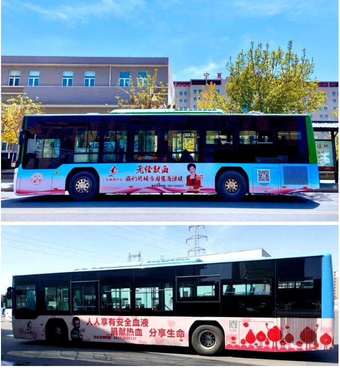 为了让更多人了解无偿献血,35路、102路的各1辆印有无偿献血形象代言人及宣传口号的爱心公交行驶在银川市主要街道。