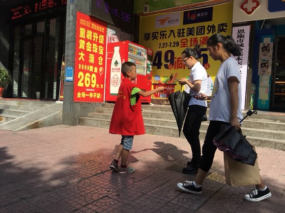 小志愿者们拿着宣传单走向人群,向路过的叔叔阿姨们讲解无偿献血知识,邀请大家参加无偿献血传递爱心。