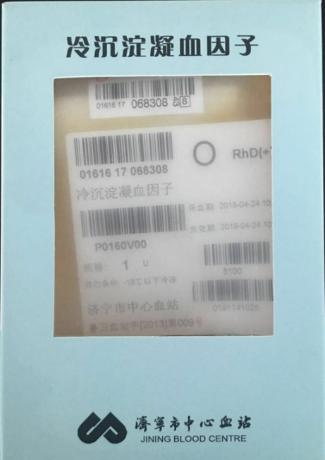 这是一袋冷沉淀凝血因子,主要含有第Ⅷ凝血因子、纤维蛋白原、血管性血友病因子以及纤维结合蛋白。一些特殊病人治疗的有效血液成分,比如先天性或获得性纤维蛋白原缺乏症,先天性或获得性凝血因子Ⅷ缺乏症,血管性血友病,甲型血友病等。