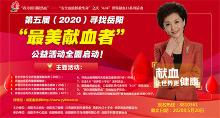 第五届(2020)寻找岳阳“最美献血者”公益活动详情请登录岳阳献血网http://www.yyblood.cn/点击查阅并下载报名,感谢您的参与!