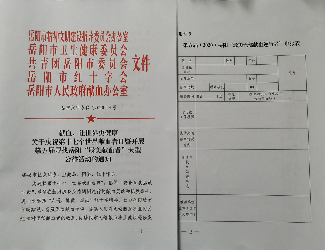 1.岳阳市文明办组织发文推荐全市各行业无偿献血者;