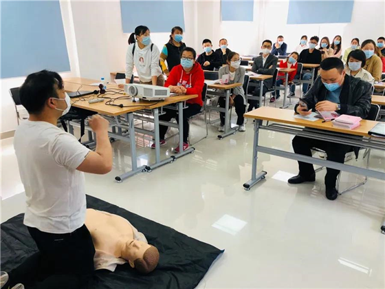 下半场培训由市红会救援队成员魏巍为志愿者们讲解如何识别心脏骤停并启动应急反应系统、以及正确且有效进行心肺复苏的方式方法,随后由志愿者上前进行模拟演练。