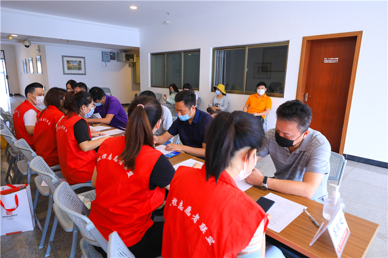 活动现场,为保证人员不聚集,参加无偿献血的体育中心干部职工分批次有序排队进入捐血车,积极配合填写献血登记表,开展征询及血液初筛检查。
